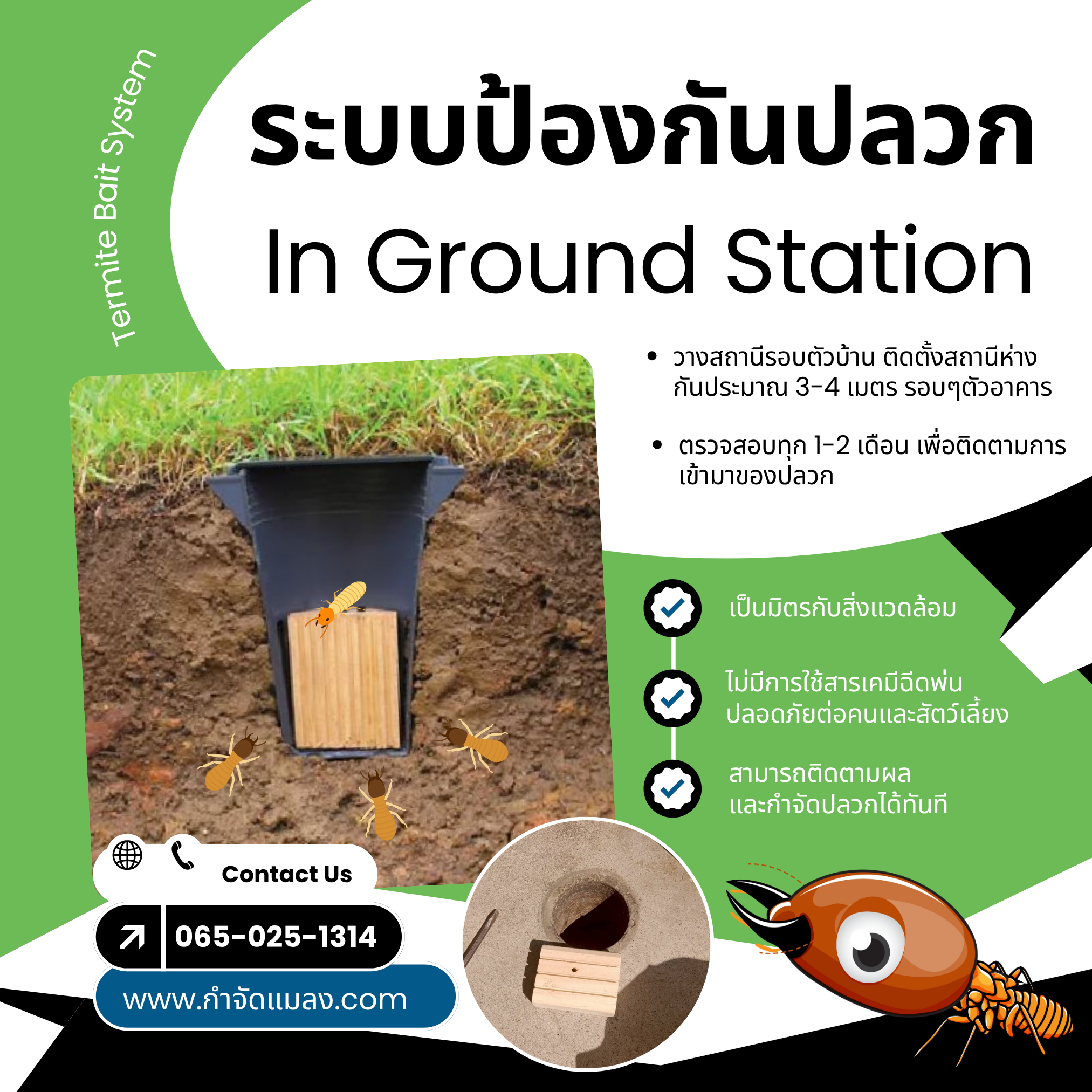 In-Ground Station เป็นระบบกำจัดปลวกแบบเหยื่อล่อที่ติดตั้งไว้ใต้ดิน โดยเป็นหนึ่งในวิธีป้องกันและกำจัดปลวกที่ได้รับความนิยม เพราะไม่ต้องใช้สารเคมีฉีดพ่นทั่วบ้าน และช่วยควบคุมปลวกได้อย่างมีประสิทธิภาพ